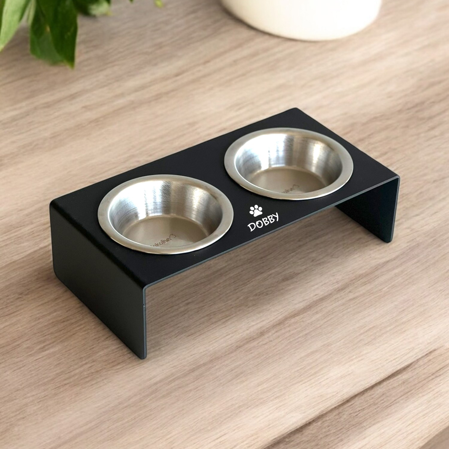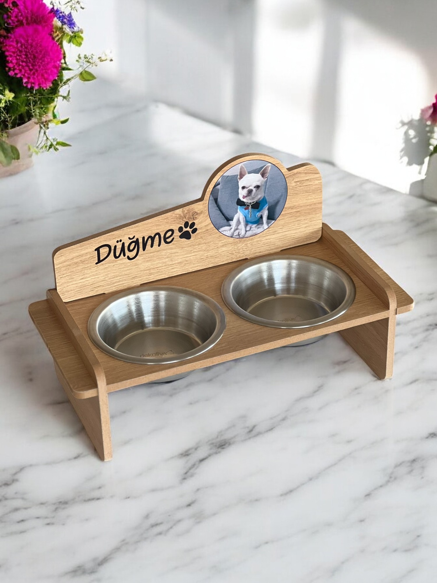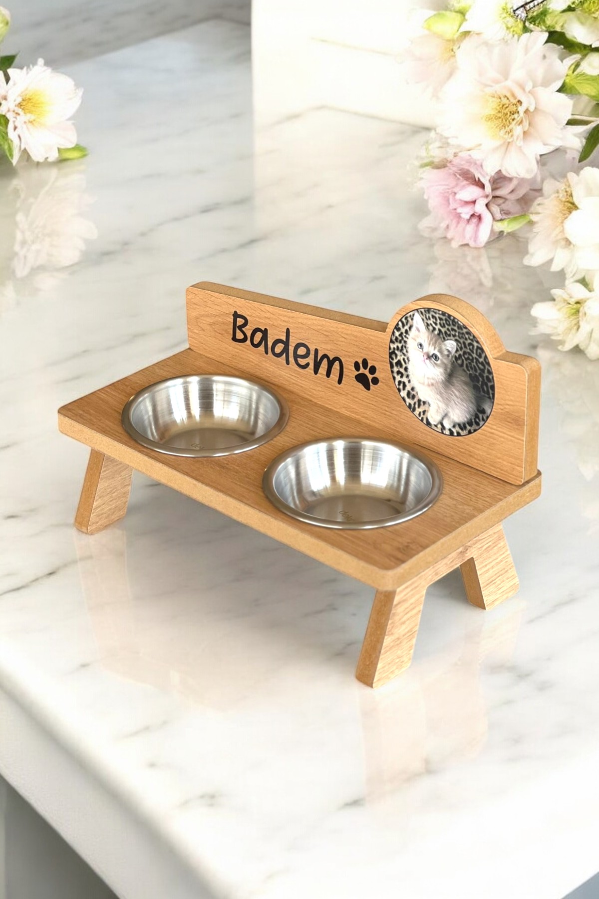 Fotoğraflı MDF Ahşap Mama Kabı İsme Özel Çelik Kaseli