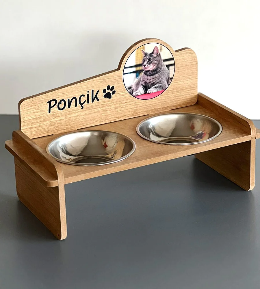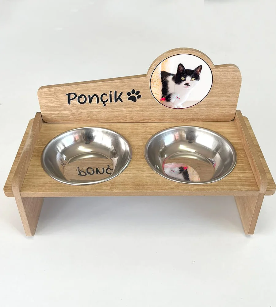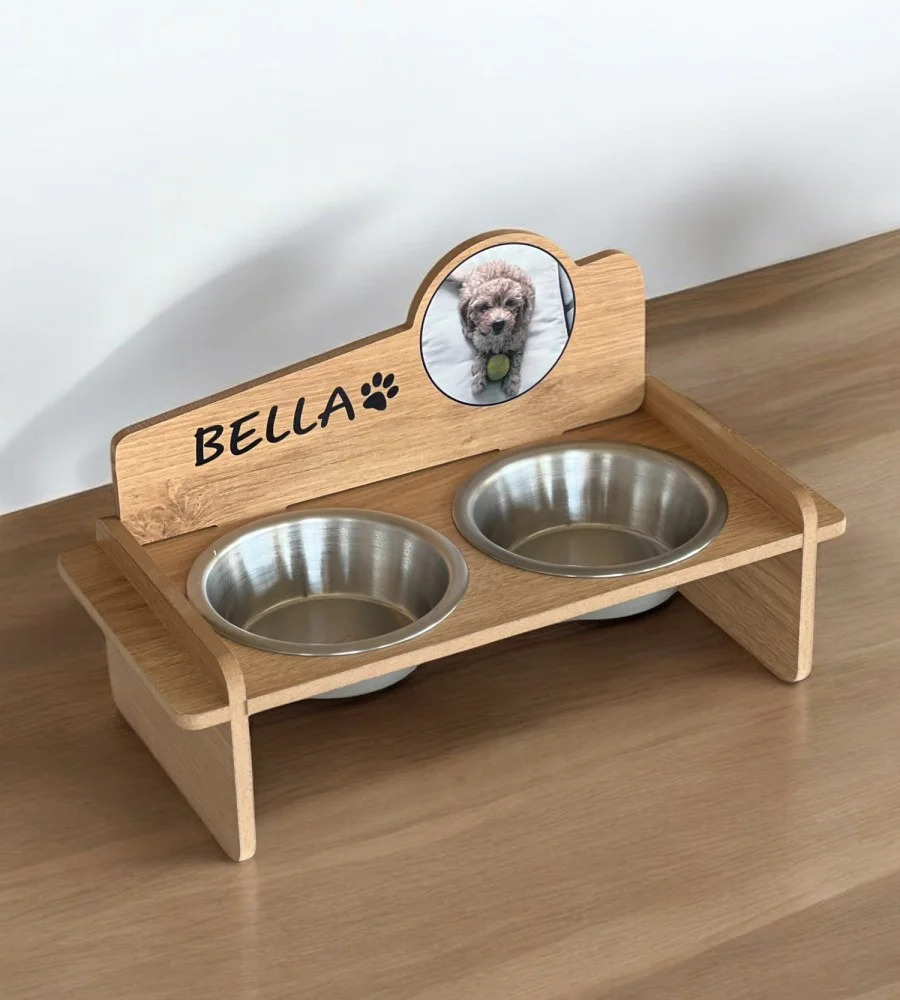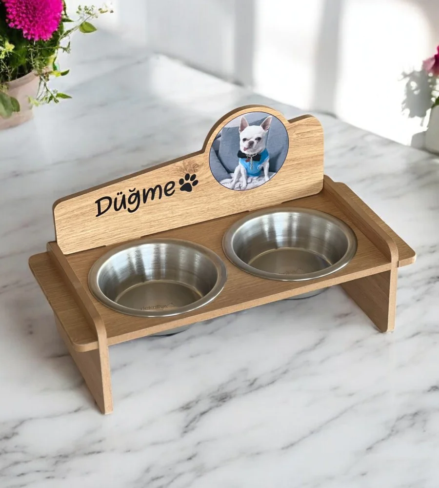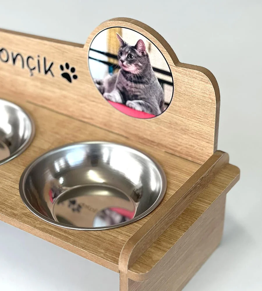 Fotoğraflı MDF 8mm Ahşap Mama Kabı İsme Özel Çelik Kaseli